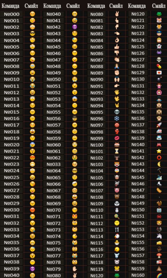 Необходимо набрать на клавиатуре № и далее номер самого смайла из приведенной ниже таблицы. Например "№001" и в чате появится ваш смайлик.
