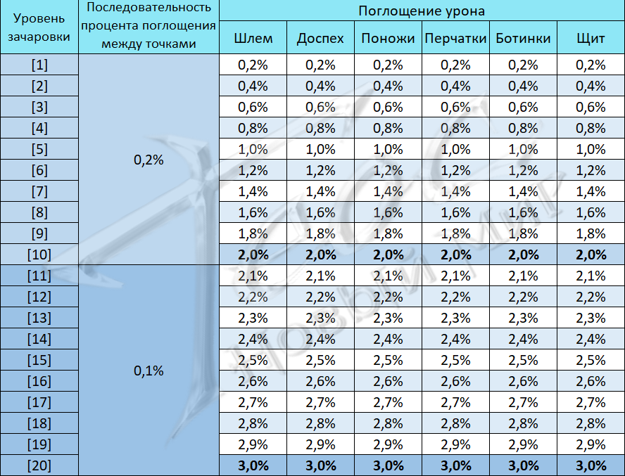 Зачаровка каждой части экипировки прибавляет величину поглощения урона в %:
