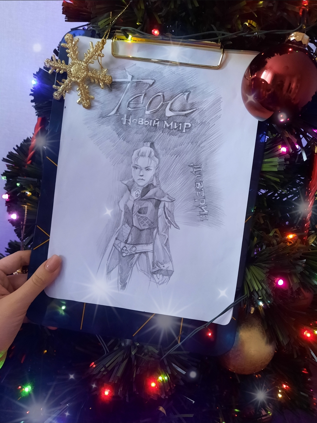 2. Создать надпись Теос Новый Мир или же написать это словосочетание на листке бумаги и вставить среди новогодних украшений так, чтобы было видно на фотографии.